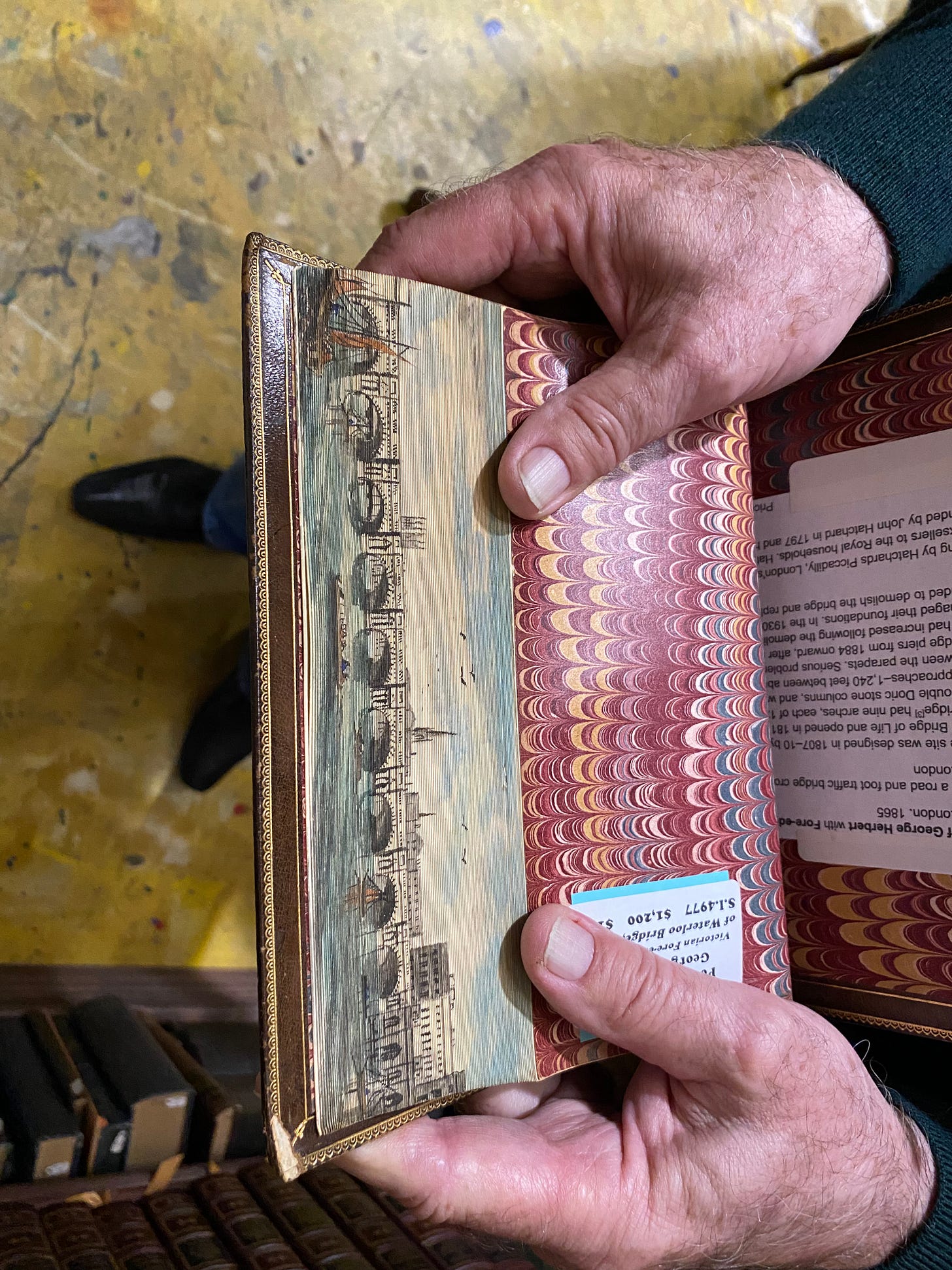 then takes a leather book from the shelf , flips the edge of the pages and explains what a fore edge painting is. A scene painted on the edges of the book pages, these are visible only when the edges are fanned. A legend has it that a duchess and a friend of Charles II of England would borrow books from him, and conveniently forget to return them. So the king, along with the court painter Sir Peter Lely and the court book binder Samuel Mearne devised a way to identify his books - to paint a hidden image on the edges of the pages. The next time the king visited the duchess, he saw a familiar title on her shelf. On questioning, the duchess protested and the king took out his trump card - a painting of the royal coat of arms on the edges.